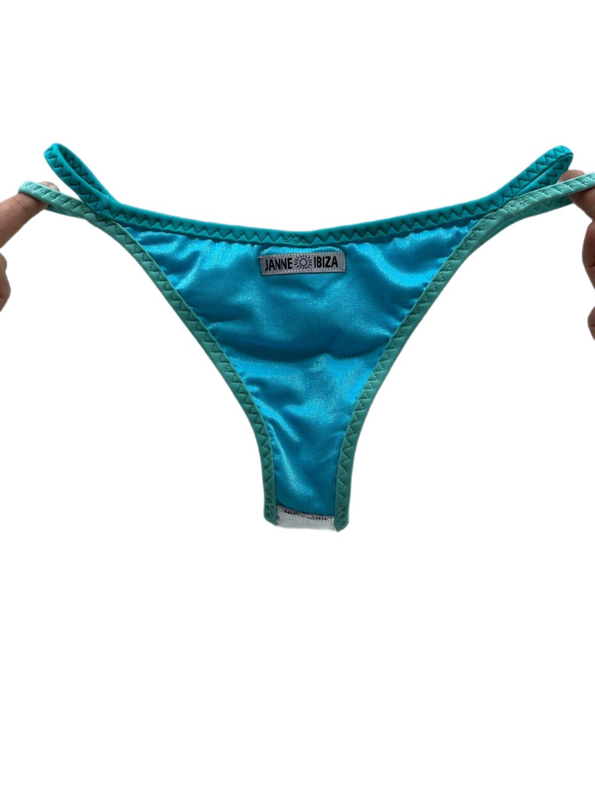 Whether paired with a matching silver bikini top or mixed with other trendy swimwear pieces, this bikini bottom is the ultimate addition to your summer wardrobe. It is a G-string thong made of sparkly silver wet-look material with black trim and straps. This cheeky V-Waist Gstring bottom is in unworn deadstock vintage condition. It is made of swimsuit material and has skimpy straps.