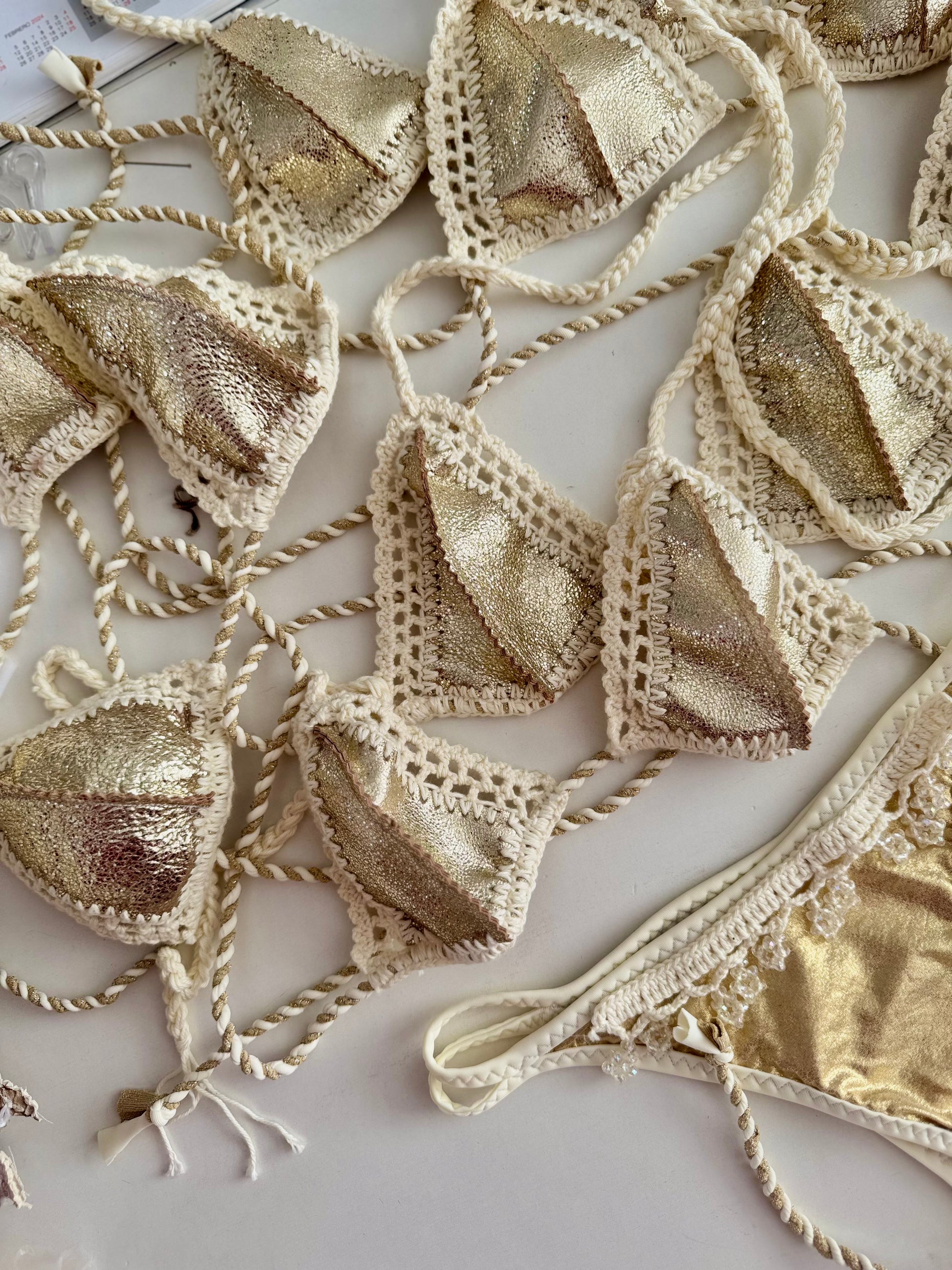 Step into sun-soaked luxury with the Golden Leather & Cream Crochet Bikini Top, a show-stopping blend of bold texture and boho detail. Designed for the woman who effortlessly balances elegance and edge, this piece fuses high-shine glam with artisan charm, making it a true standout in any swimwear collection.