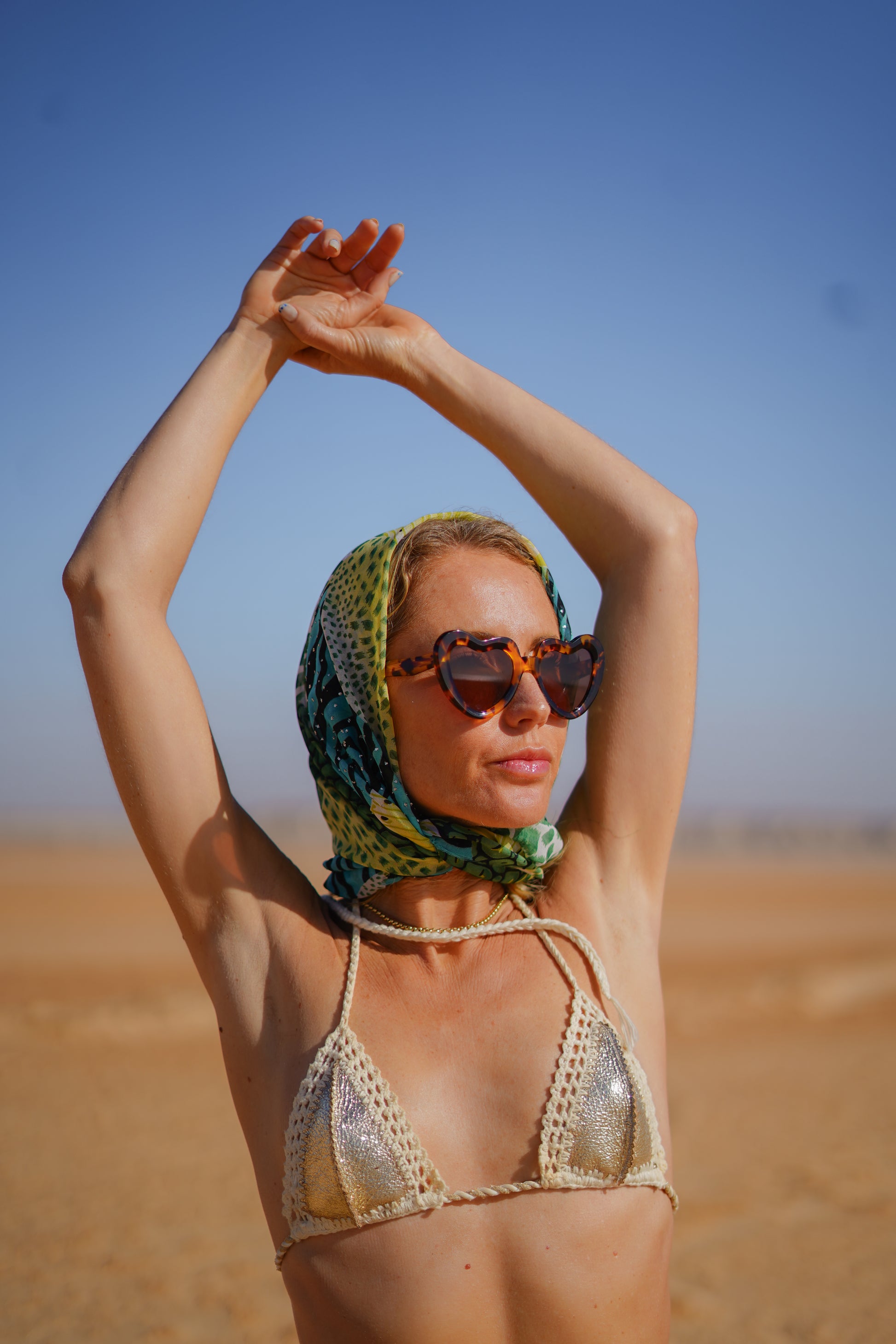 Crafted with golden faux leather fabric, this triangle bikini top offers a radiant metallic sheen that shimmers in sunlight, giving you a luminous glow. The material is soft yet structured, creating a flattering and supportive fit that elevates your natural silhouette. Along the edges, intricate hand-crocheted cream trim adds a beautifully delicate touch, contrast stitching that softens the bold gold and lends a handcrafted, designer feel.
