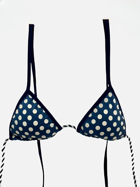 Featuring a classic navy blue base adorned with crisp white polka dots, this bikini top is as stylish as it is versatile. The polka dot pattern never goes out of style, making it a must-have for fashion-forward beachgoers and lovers of retro-inspired designs. Whether you're lounging by the pool, sunbathing on a yacht, or sipping a tropical drink at a beachside bar, this bikini top promises to turn heads with its effortlessly cute and flattering look.